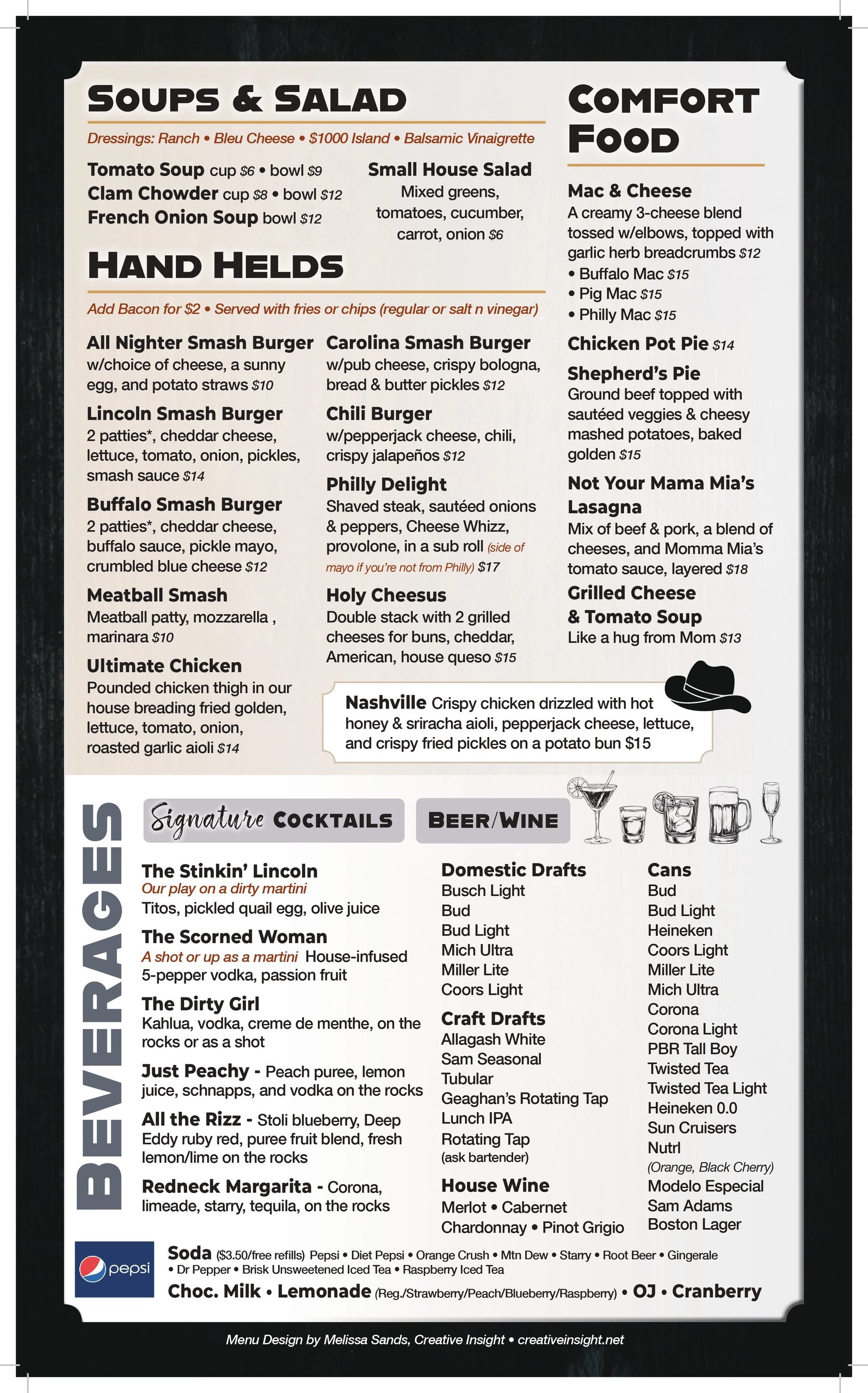 Our very large bar features a back bar of a 1950 Jeep Willy with custom built 12 tap system with a mix of your favorite domestics as well as some of Maine’s best craft drafts. We have a full bar with some professional bar tenders that can sling drinks with the best of ’em.